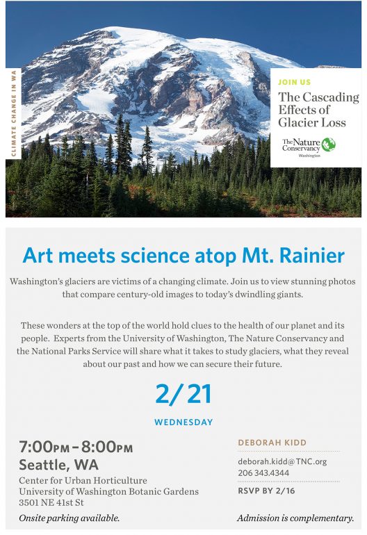 Join the Nature Conservancy, University of Washington and the National Park Service for a dynamic discussion about Washington’s changing glaciers and to view stunning new photographs that compare century-old images with today’s changing glaciers. CIG’s Heidi Roop will discuss building capacity to act and adapt to our changing climate.