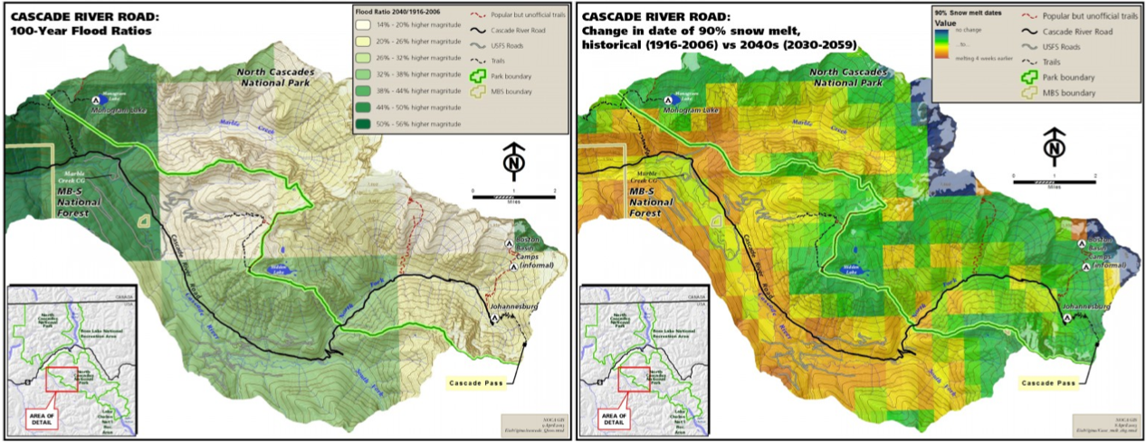 Figure 2. Projected change in the 100-year flood magnitude for the Cascade River Basin estimated at 1/16th degree resolution (left). Projected timing shift of snowmelt in the Cascade River Basin estimated at the 30-arc second resolution (right). Maps courtesy of Anne Braaten from the National Park Service.
