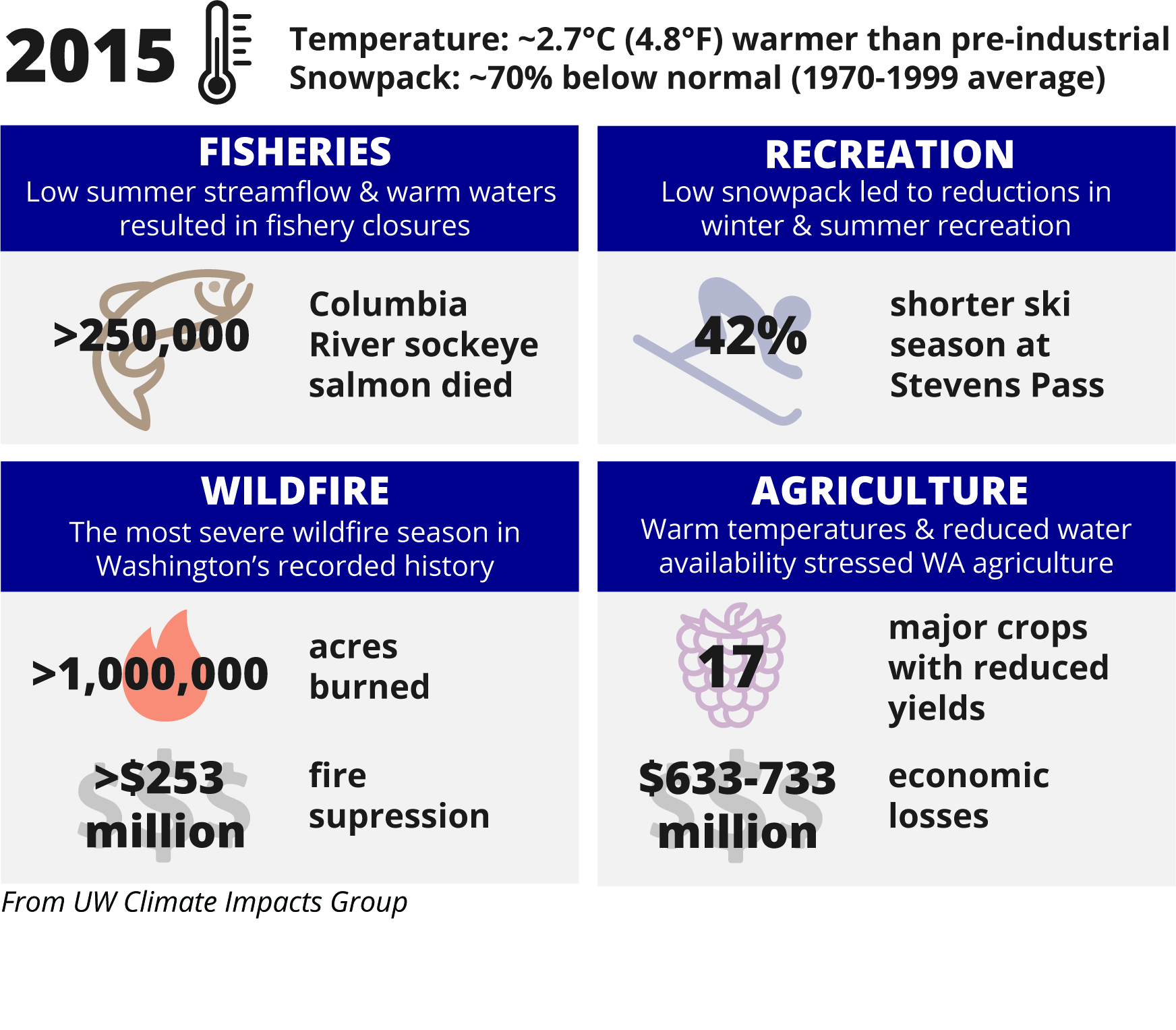 Figure 6: The extreme climate of 2015 provided a preview of impacts likely to become more frequent in Washington state if greenhouse gas emissions are not dramatically reduced. Regional temperatures were about 2.7°C (4.8°F) warmer than pre-industrial and Washington state snowpack was about 70% below normal. Data from: Fourth National Climate Assessment.