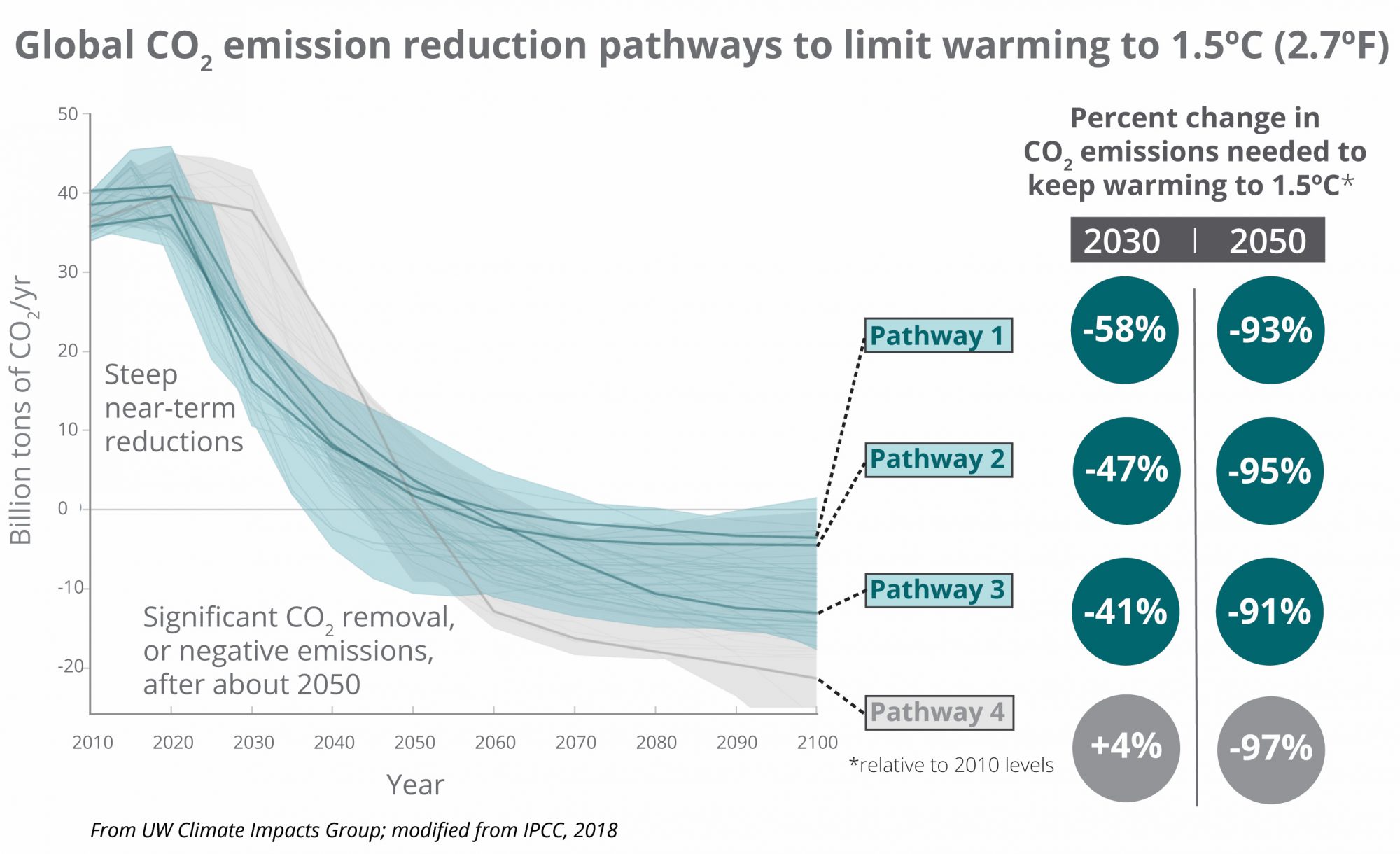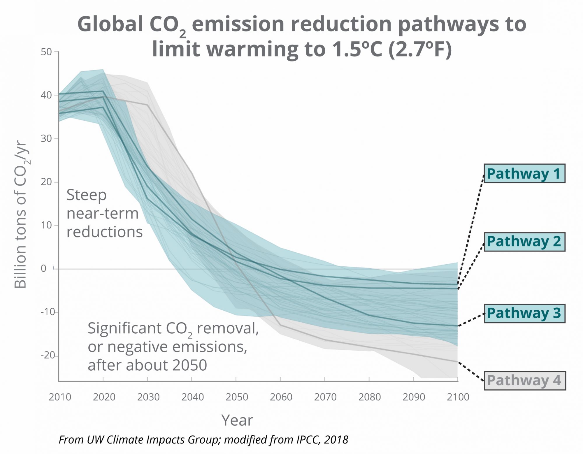 Figure 7: Limiting warming to 1.5°C can only be achieved if action is taken to significantly reduce global CO2 emissions well before 2030 and if global emissions are decreased to ‘net zero’ by around 2050, as shown in the blue shaded area and by Example Pathways 1-3. The gray shaded area and Pathway 4 show CO2 emission pathways that would lead to global temperatures “overshooting” 1.5°C for a few decades and returning to below 1.5°C before 2100. All pathways require “rapid and profound near-term decarbonization of energy supply” and some amount of atmospheric CO2 removal. Figure modified from IPCC Special Report on 1.5°C (Summary for Policymakers, Figures SPM.3a & SPM.3b).