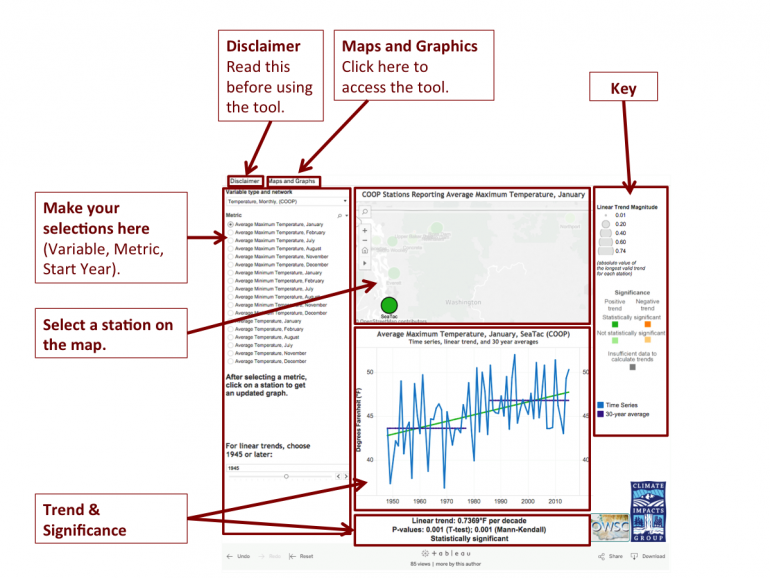 The interactive historical trends tool was created using Tableau. The tool includes three panels: (1) Disclaimer, (2) Maps and Graphics, and (3) Data Sources. The layout of the tool is illustrated in the figure below. The main features of the tool are a map showing trends for all stations with data on a particular metric, under which is a plot showing the year-to-year changes for one particular measurement site. All user selections can be made on the left-hand side of the figures, while all legends are included to the right.